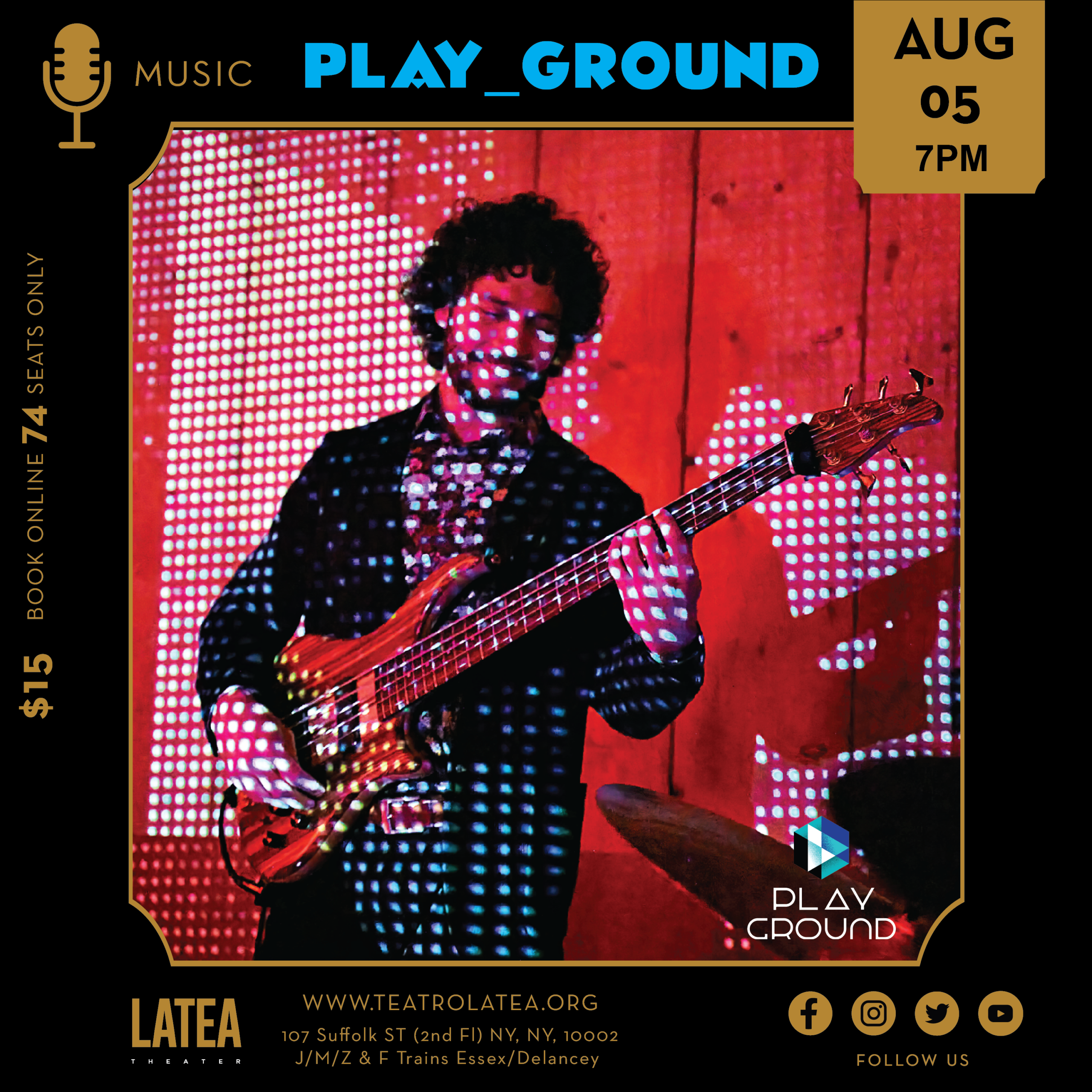 Play_Ground, a unique musical treat, taking you on a musical journey spawning from electronic beats to Puerto Rican Bomba, Balkan music, Jazz, Funk, and Hip Hop, fusing its founders’ love for visual art, philosophy, Latin Jazz, back streets of New York, jungles of San Lorenzo, Slovenian glacial lakes, outer galaxies, and much more.