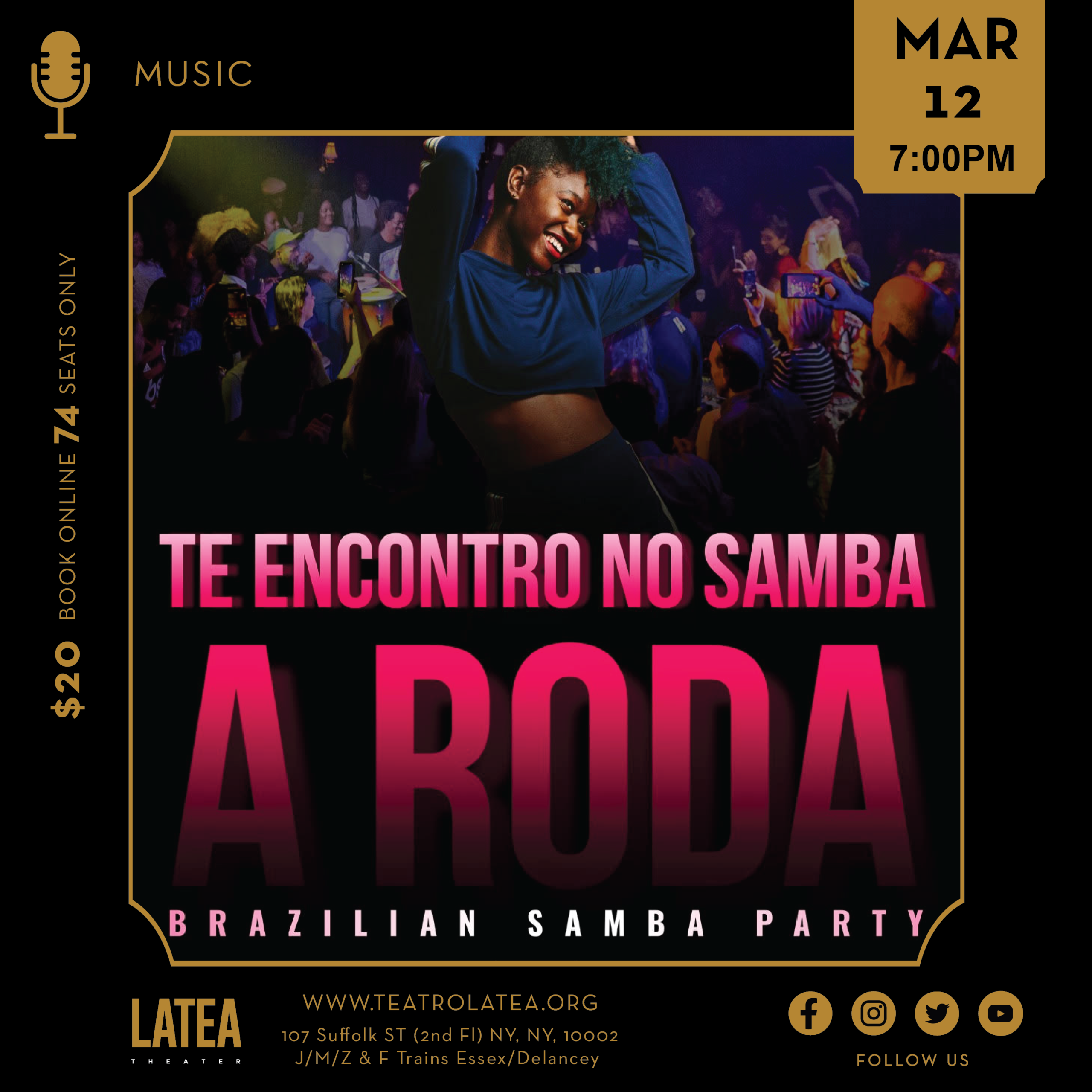 Our roda de Samba is back with 3 hours of Live music with Turma D’U samba, Dj , and free samba dance class with Eric Celestino.
