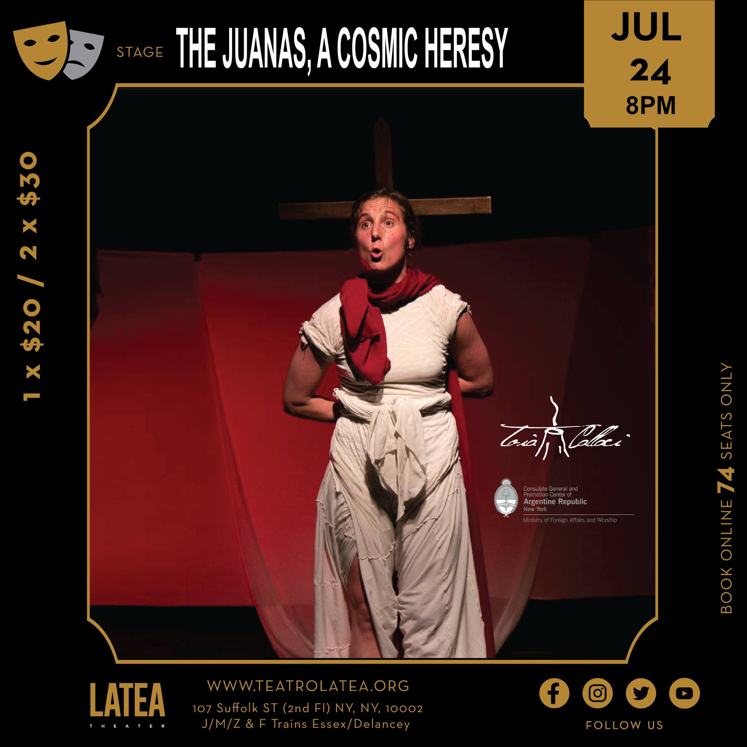 Inspirada en la vida de Juana Manso, Juana La loca, Jean D’Arc, Juana Azurduy, La Papisa Juana, Giovanna Marturano, Juana de Ibarboreau y Sor Juana Inés de la Cruz. Mujeres que lucharon por sus ideales, vivieron la prisión y el convento, fueron a la guerra, liberaron a sus pueblos y a sus almas, escribieron cosas hermosas, las sepultaron bajo otro nombre, siguieron su instinto, murieron en la pobreza absoluta pero quedaron estampadas en los billetes de sus países, amaron locamente, se hicieron pasar por hombre para escapar a su destino, sufrieron violencia doméstica, adicciones y abuso de poder, fueron procesadas y condenadas. En la sangre se oye un grito hoy, aquí, un eco.